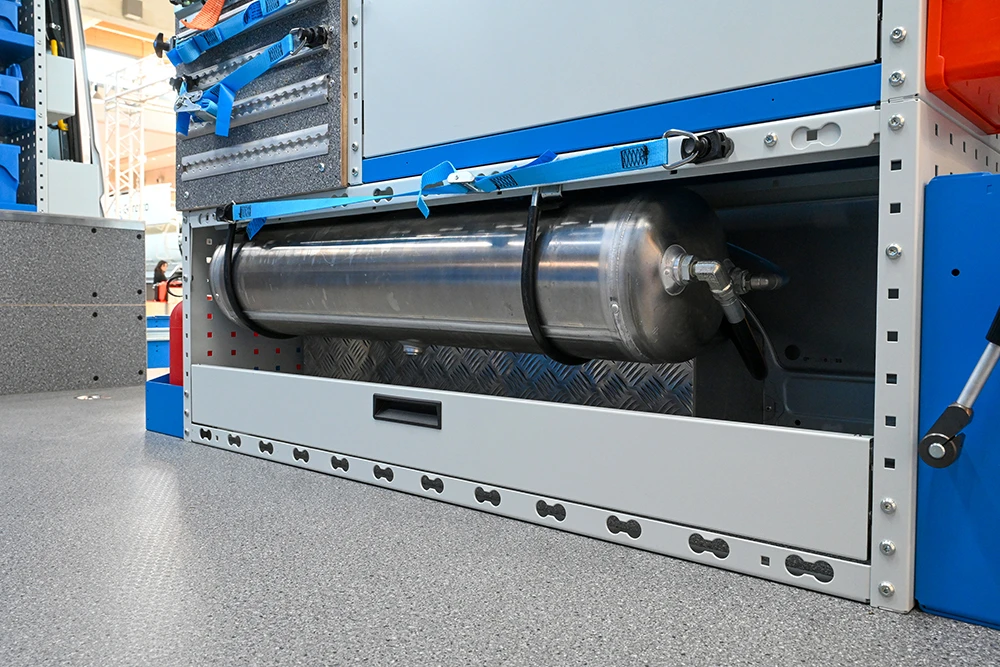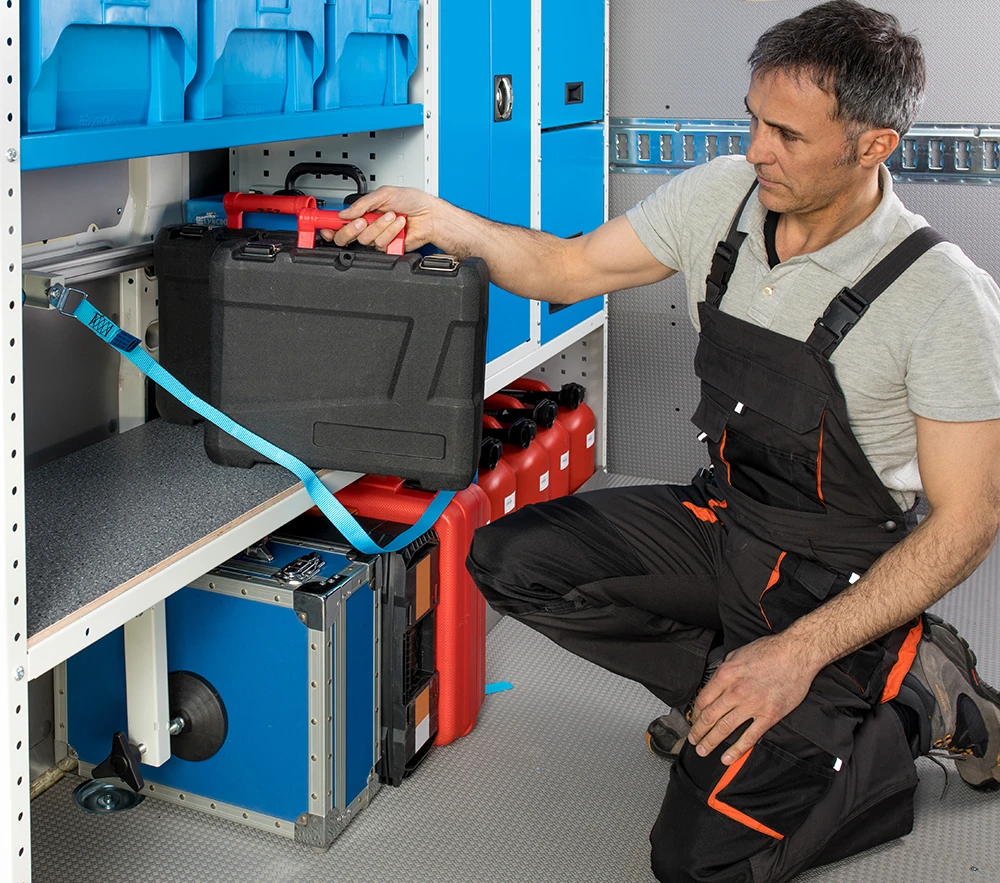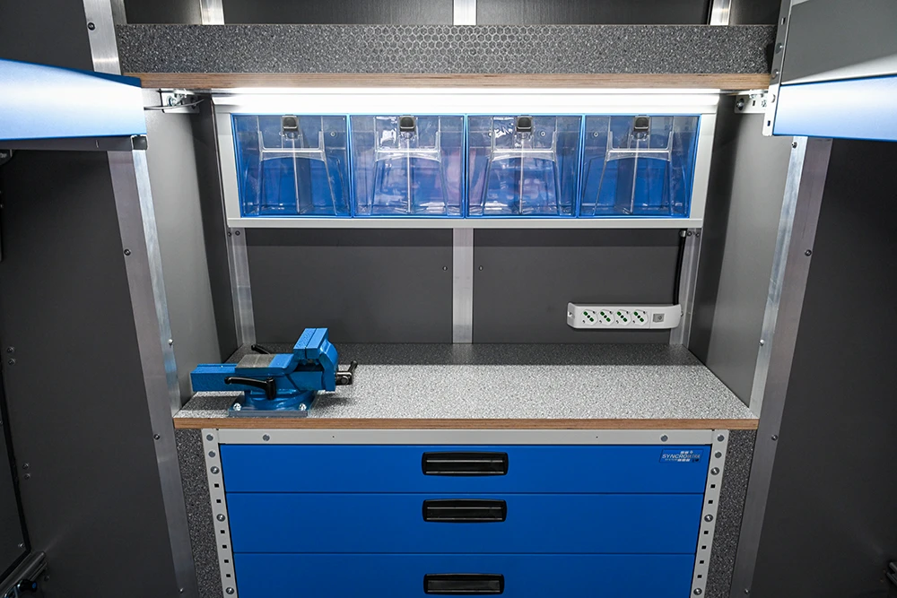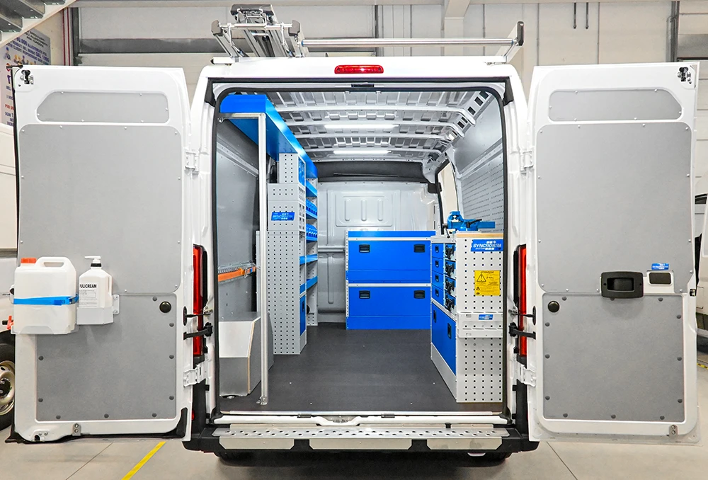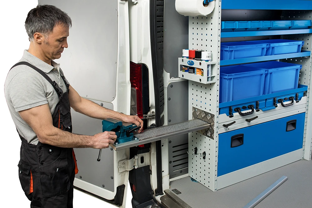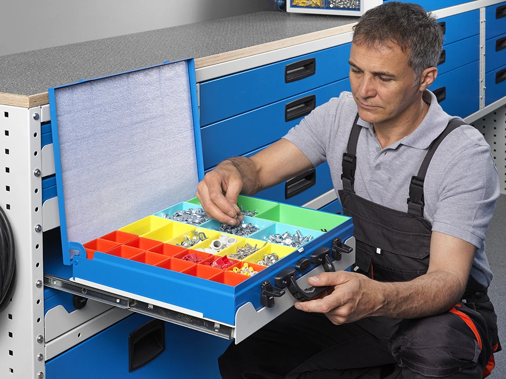 Vďaka modulárnym regálom , zásuvkám, skrinkám a úložným boxom dokážete využiť každý centimeter vozidla a mat všetko náradie či materiál vždy prehľadne uložené.